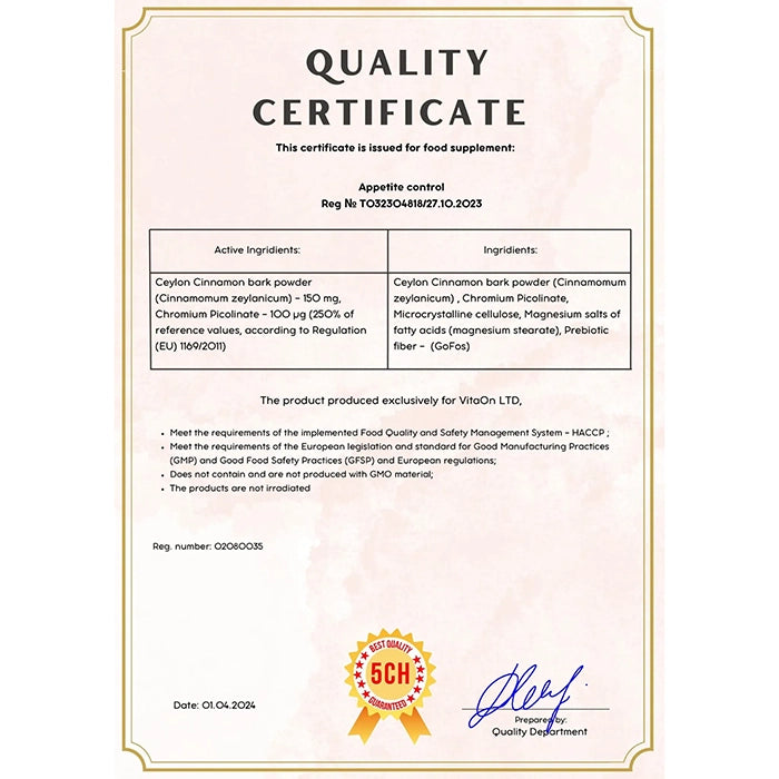 Het vertrouwen van onze klanten is onze voornaamste prioriteit. Daarom wordt onze “Appetit Control” vervaardigd volgens de Good Manufacturing Practice (GMP) ‑ de gouden standaard in de industrie. Dit garandeert strenge controle in elke fase – van de selectie van grondstoffen tot het eindproduct. Als extra waarborg voor authenticiteit en veiligheid is het product geregistreerd bij het Agentschap voor Voedselveiligheid met registratienummer T032304818.