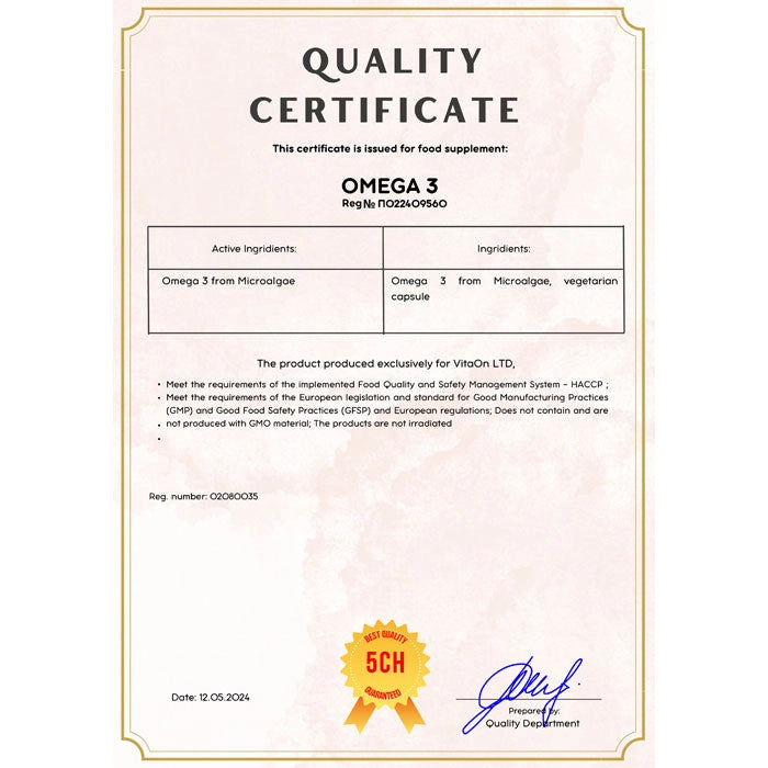 Omega 3 van VitaOn heeft een volledig plantaardige oorsprong, wat het bijzonder geschikt maakt voor mensen die veganisme beoefenen en voor degenen die niet de benodigde dagelijkse hoeveelheden omega-vetzuren consumeren vanwege dieetbeperkingen.